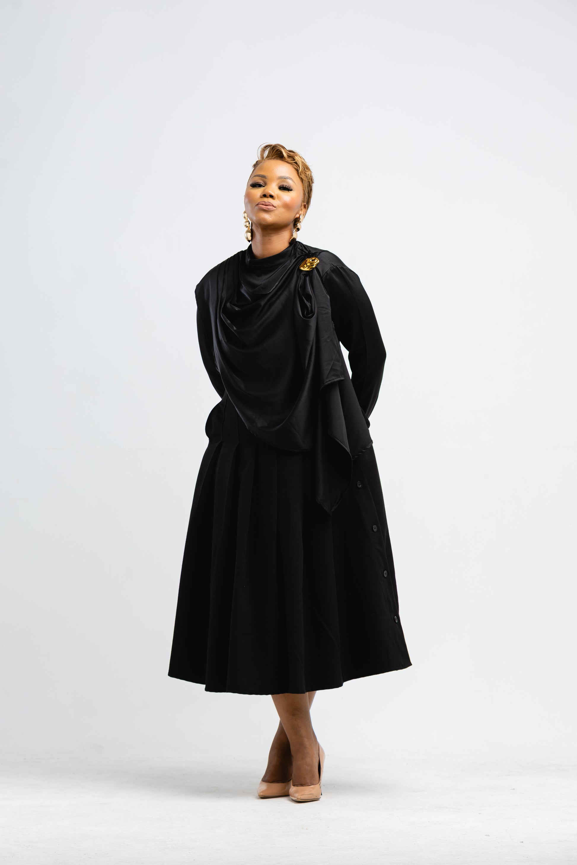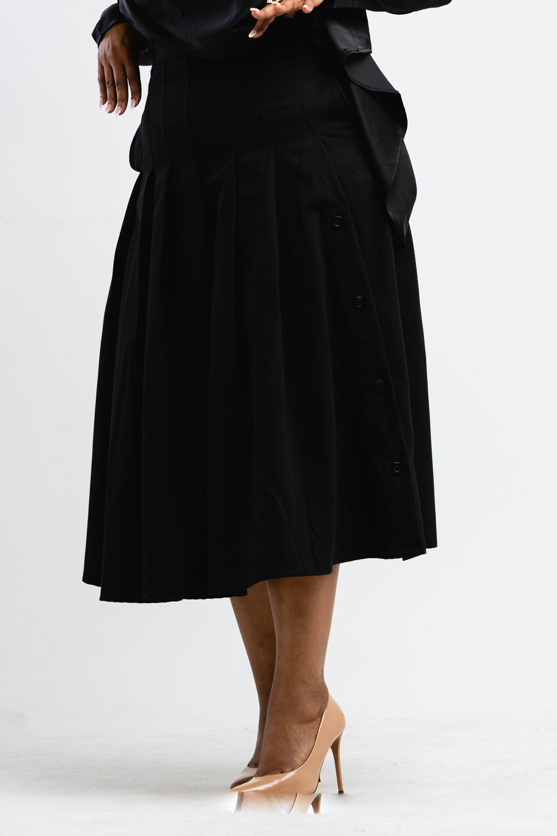 High-waisted structured fit · Smooth, medium-weight fabric · Defined pleats · Side button accents · Midi length · Comfortable with a clean, tailored drape