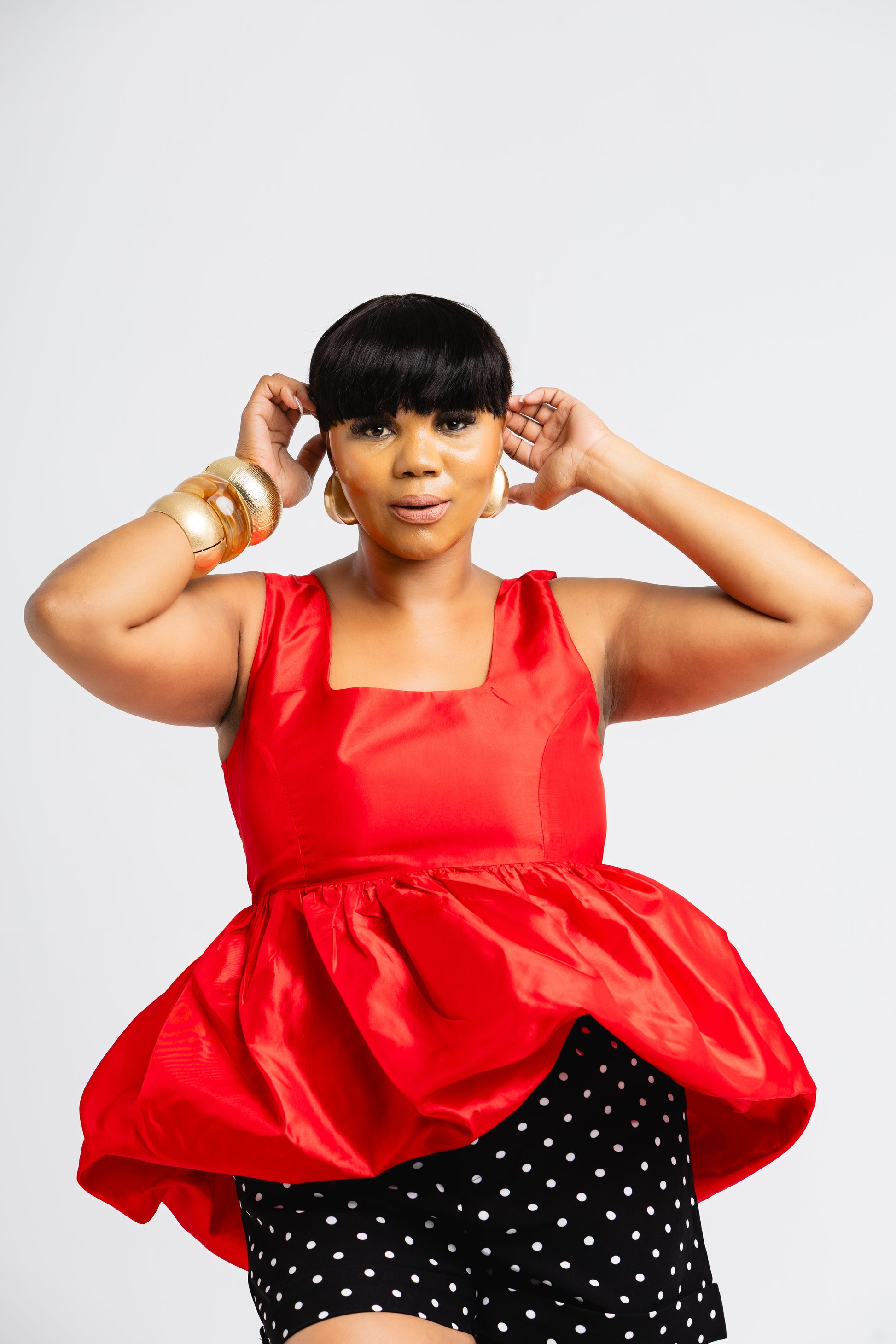 • Dramatic peplum hem for volume and movement