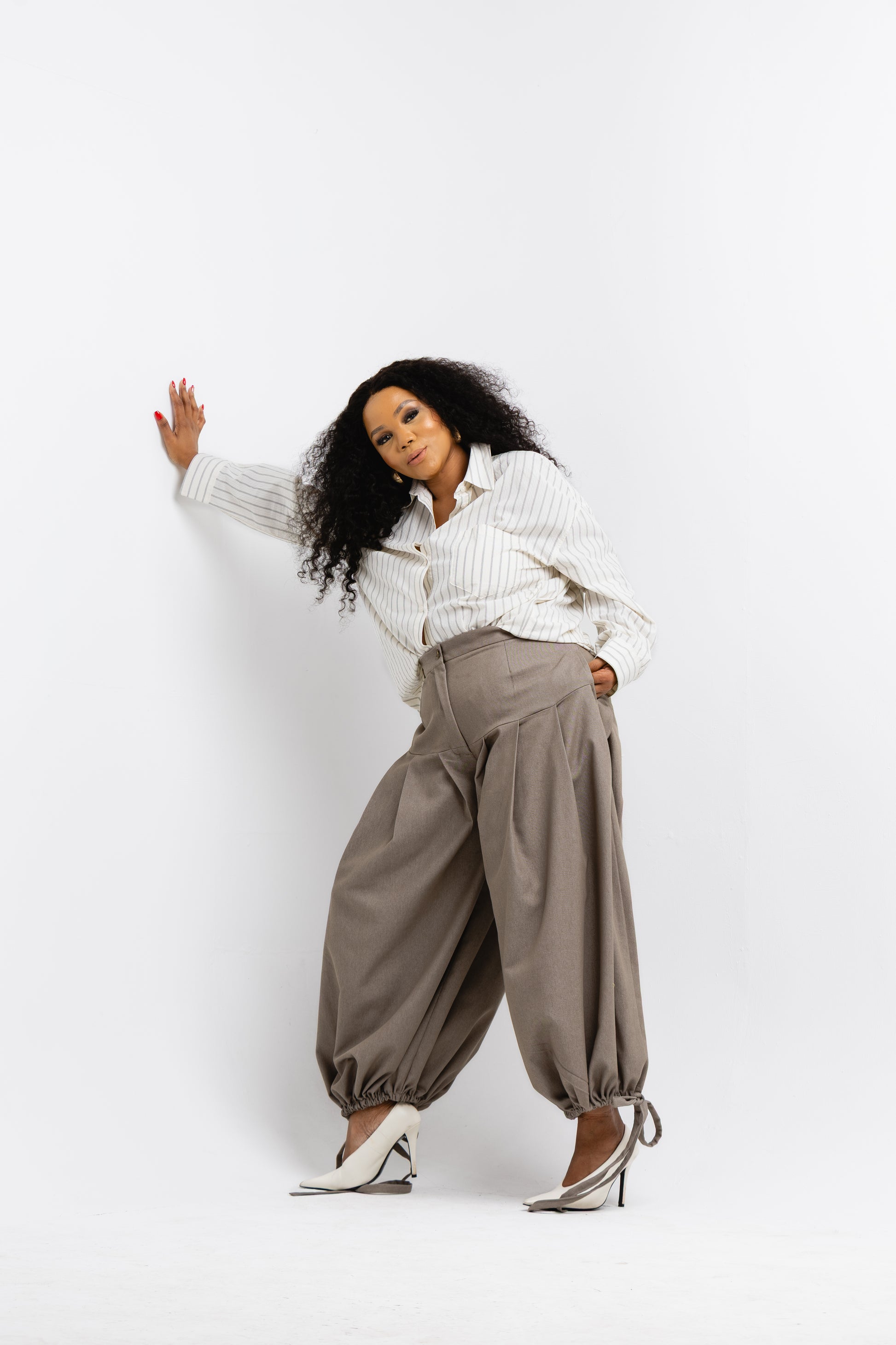 These trousers are cut to balance bold volume with refined structure. The high waist defines the silhouette while the gathered ankle creates that signature Hombakazi shape. Whether styled relaxed or cinched, the movement is intentional and elegant.